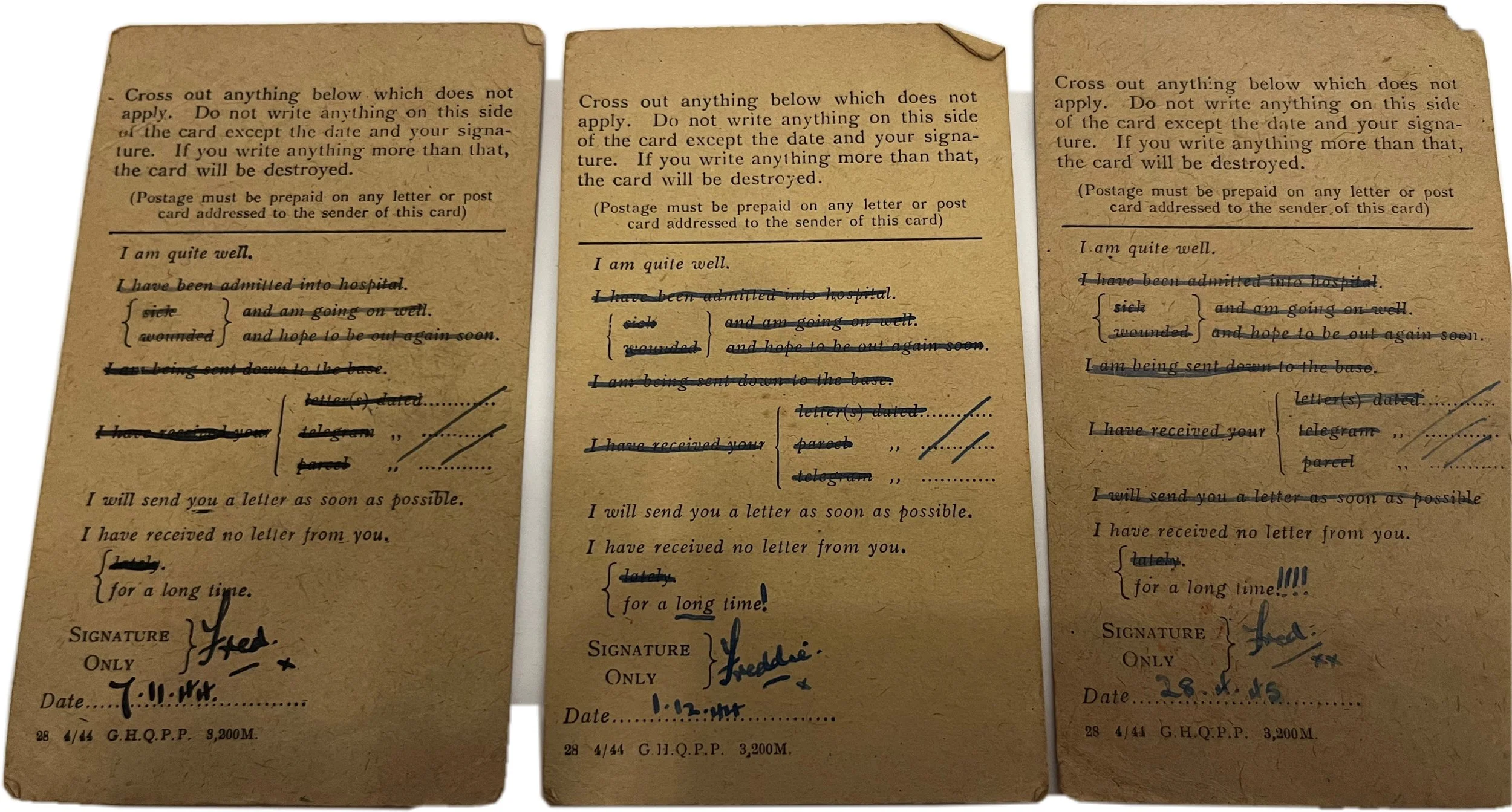 In the depths of the war, soldiers often were not permitted to send lengthy letters for fear of accidentally revealing classified information. Instead, they filled out prewritten cards with details about how they were feeling, whether they were sick or injured, and when they would correspond next.