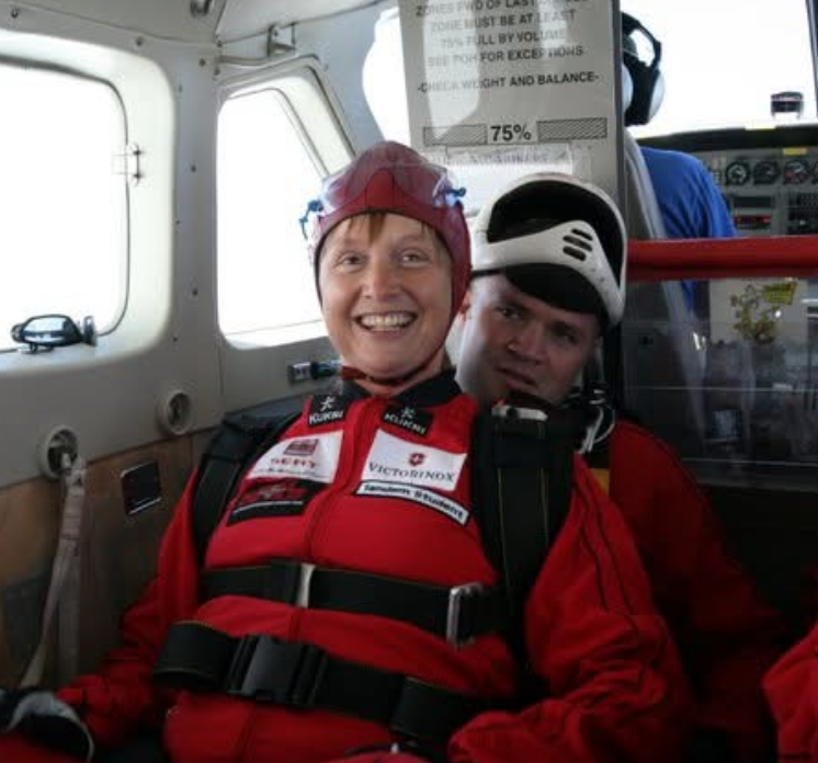 Angela during her 2016 skydive, one of many challenges completed to raise money and awareness.
