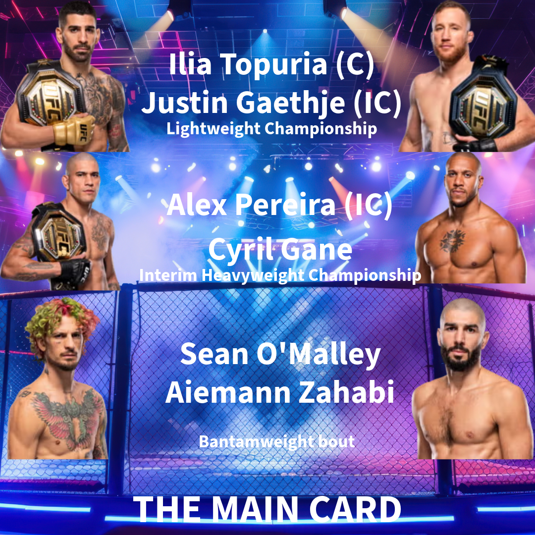 Ilia Topuria defends the Lightweight Title versus Interim Champion Justin Gaethje.