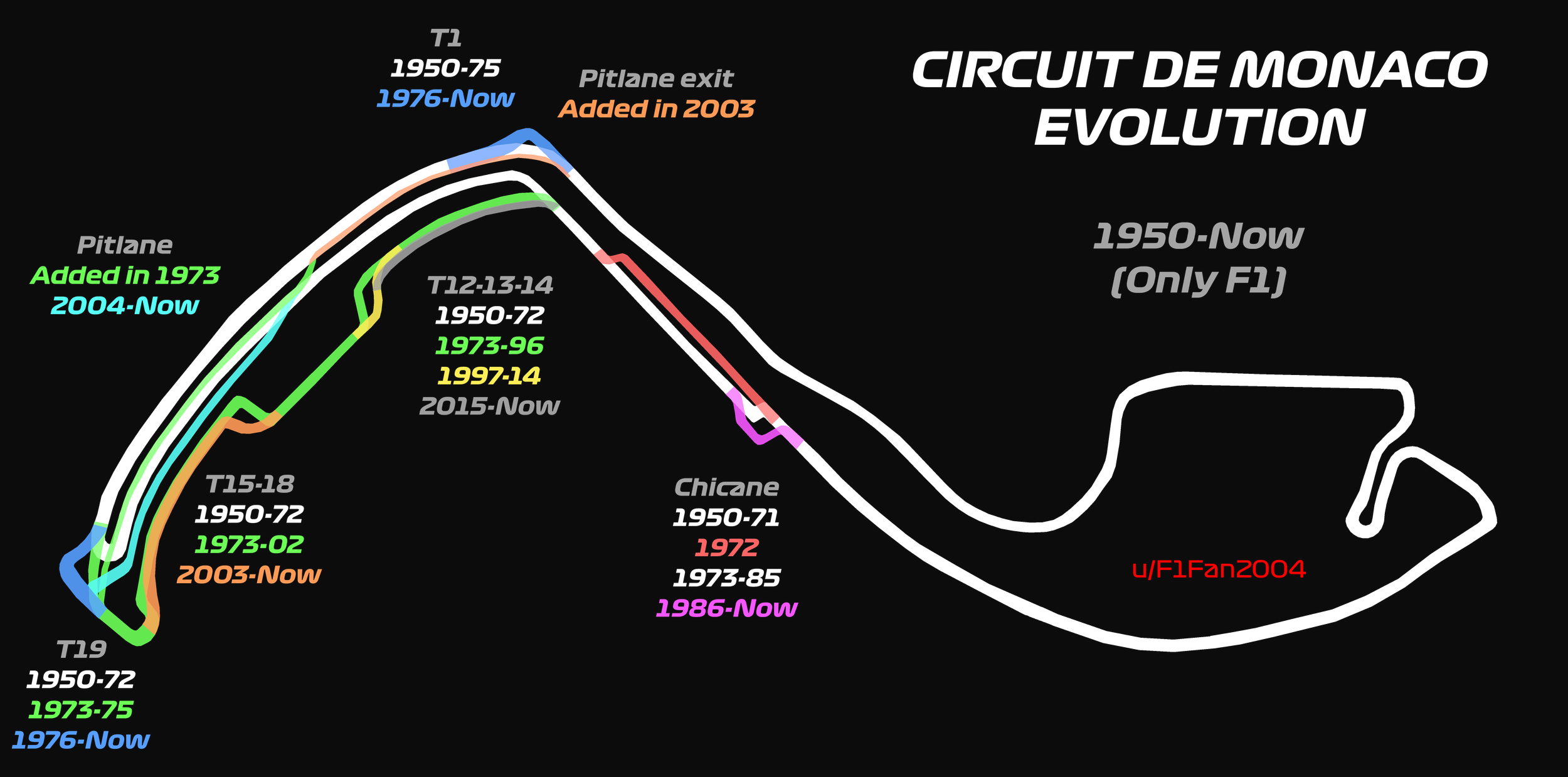 The Monaco track is notoriously the most difficult race of the calendar, drivers will have to find just one or two places within a lap to even take a second to blink, as one wrong move can end in disaster. Despite this, the narrowness of the track has created the overtaking problem and several layouts, demonstrated in this graphic, show what has been changed to help aid the dubbed ‘billion dollar problem’ that Formula One and Monaco have, to make sure the race is interesting enough to continue to entice viewers and fans to one of the most expensive GP’s on the calendar. Especially with the news last year that the race contract has been extended to 2035.