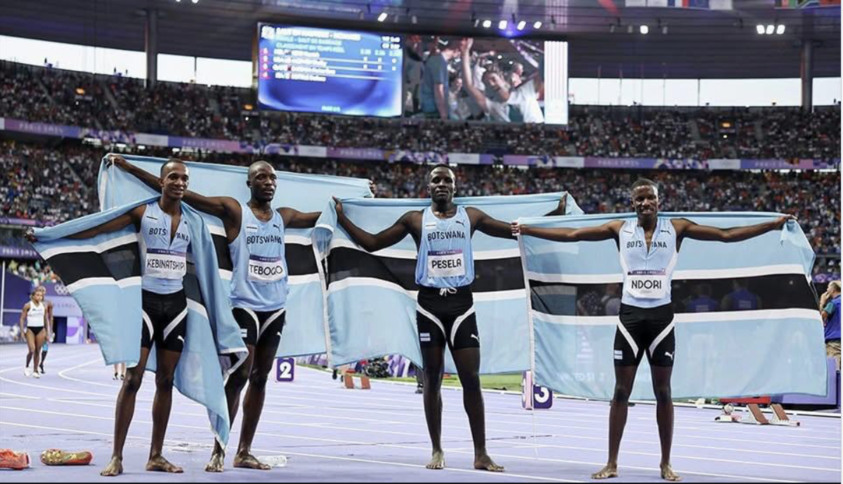 Botswana’s relay team celebrating silver in the 4x400m at the Paris Olympics, after an amazing battle with the USA Team. Credit photo: @quickiefeed