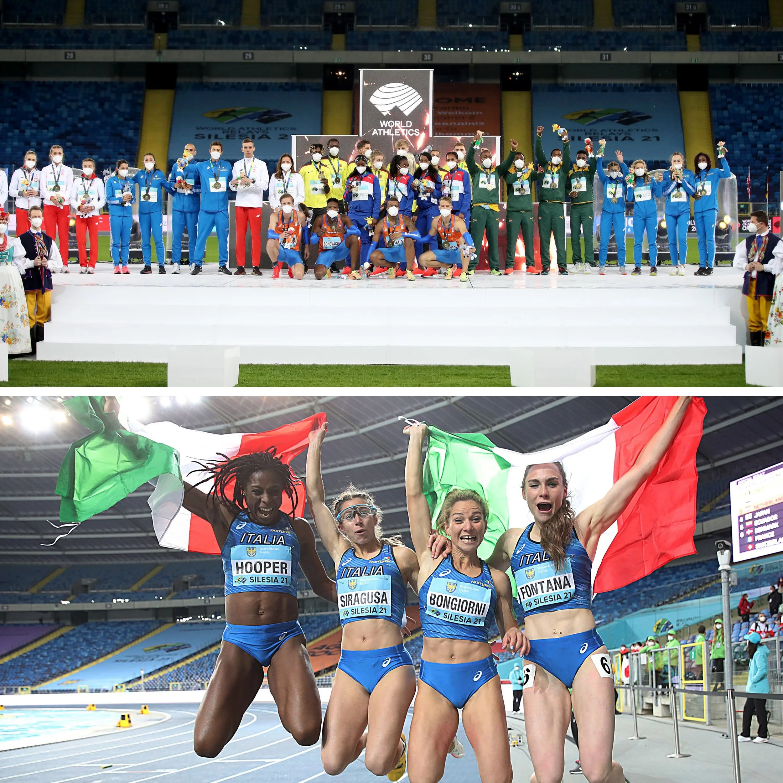 Podium ceremony in Silesia, where Italy’s women’s 4x100m team secured gold in a tightly contested final. Credit photo: UNA GRANA/Fidal